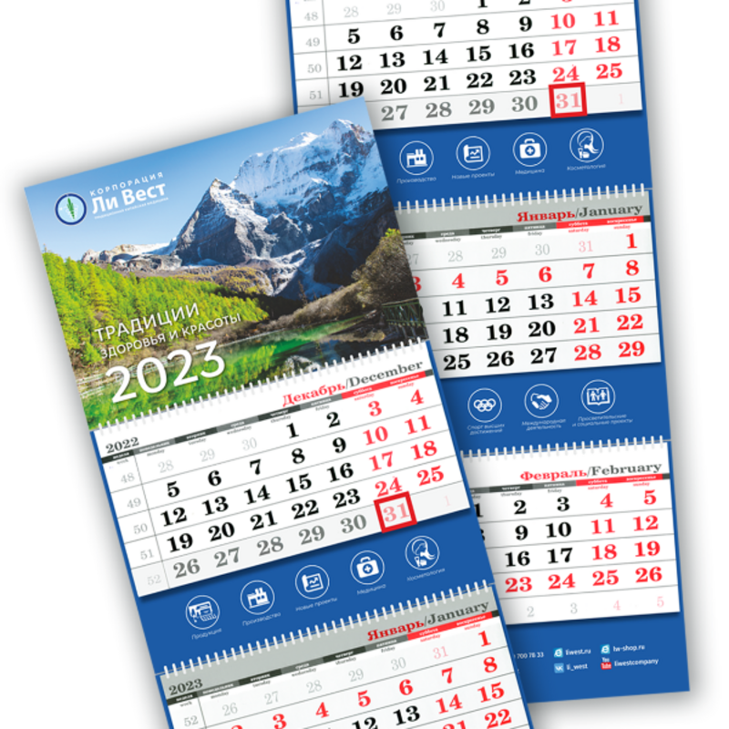 Трехблочный настенный квартальный календарь с символикой корпорации — яркое дополнение к общему стилю офиса или ИСЦ.