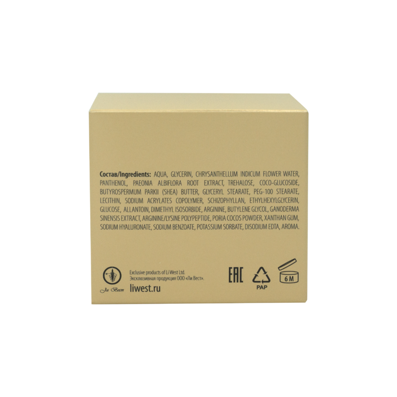 Гидролат золотой хризантемы, пантенол, экстракты корня пиона белого, ганодермы, пории кокосовидной, масло ши, трегалоза, лецитин, вытяжка щелелистника, аллантоин, аргинин, полипептид аргинин/лизин.